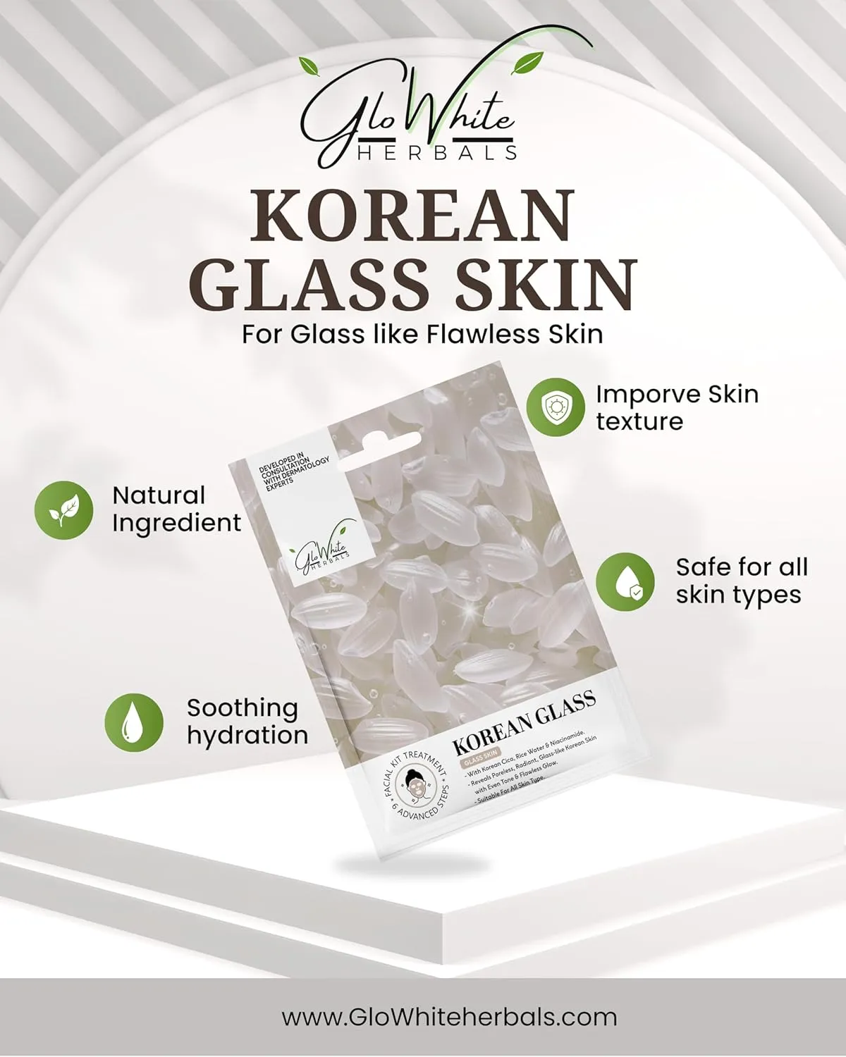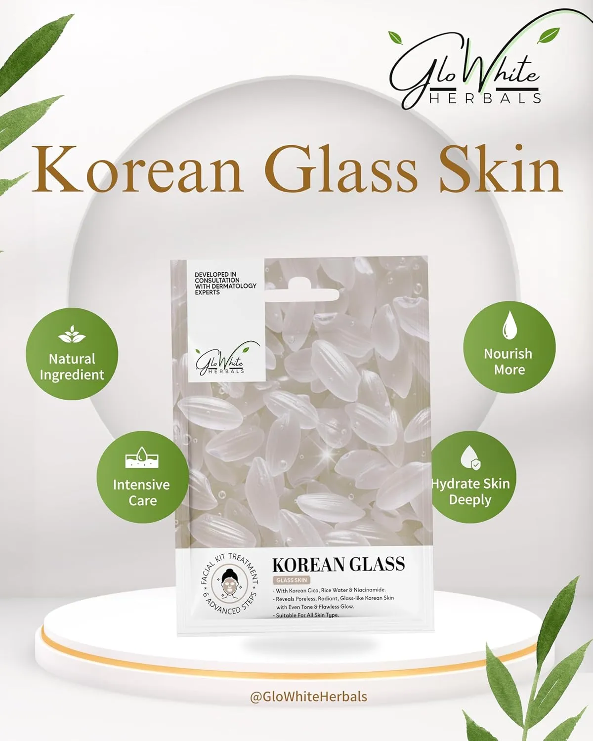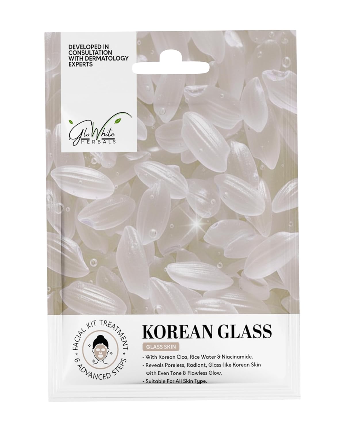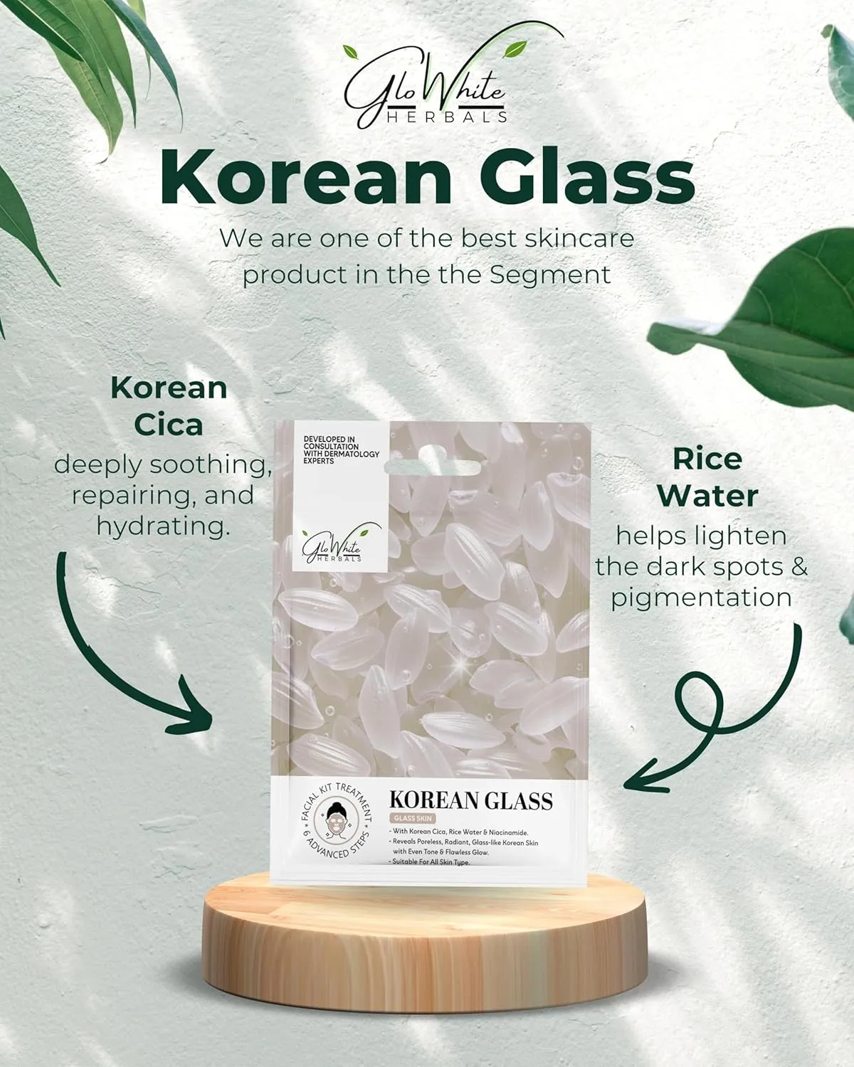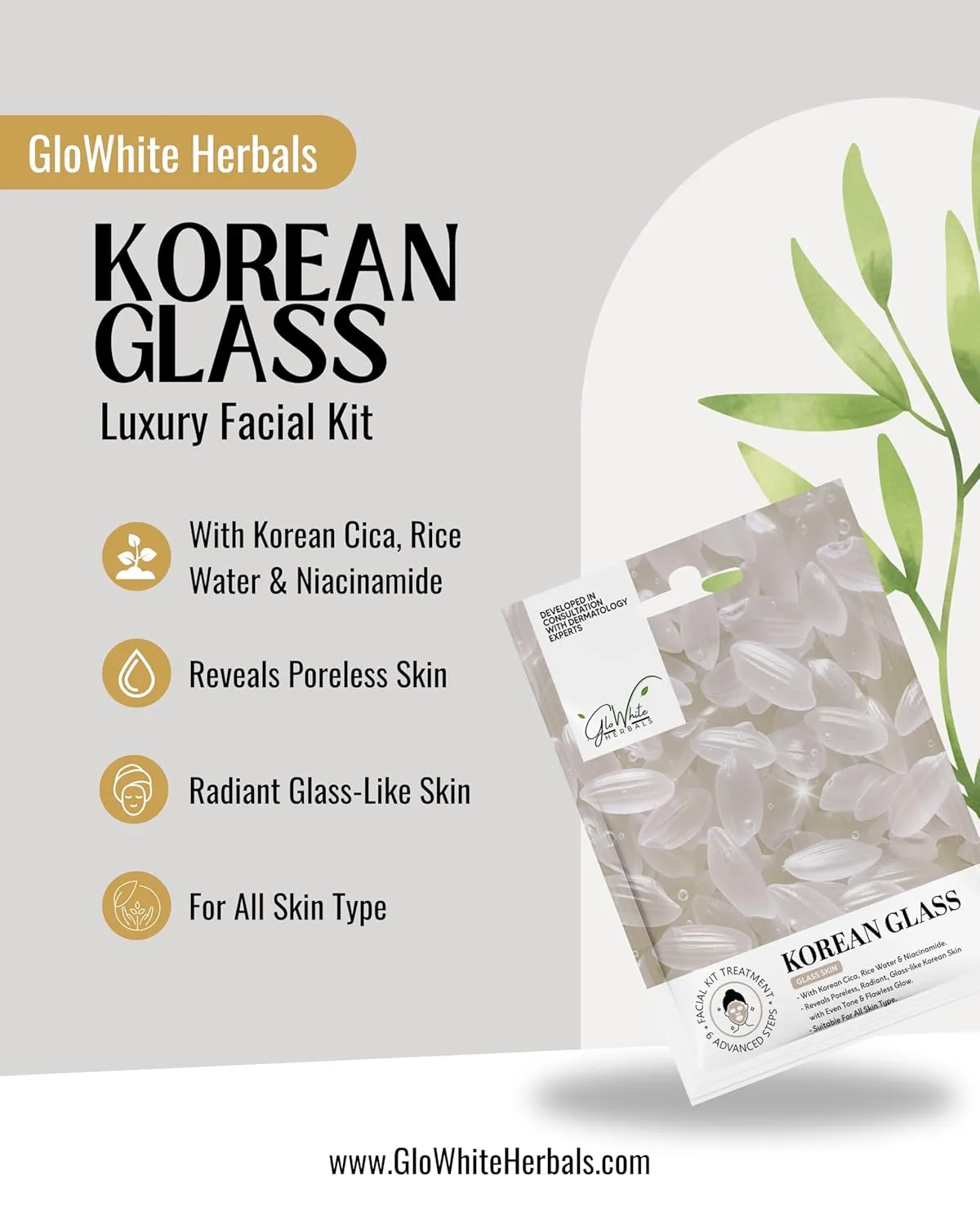 - ✨ Achieve Korean Glass Skin Glow Experience radiant, poreless looking skin with the Glowhite Herbals Korean Glass Skin Facial Kit. Infused with Korean Cica, Rice Water and Niacinamide, this advanced facial helps improve skin texture and reveal naturally luminous glass-like skin.
