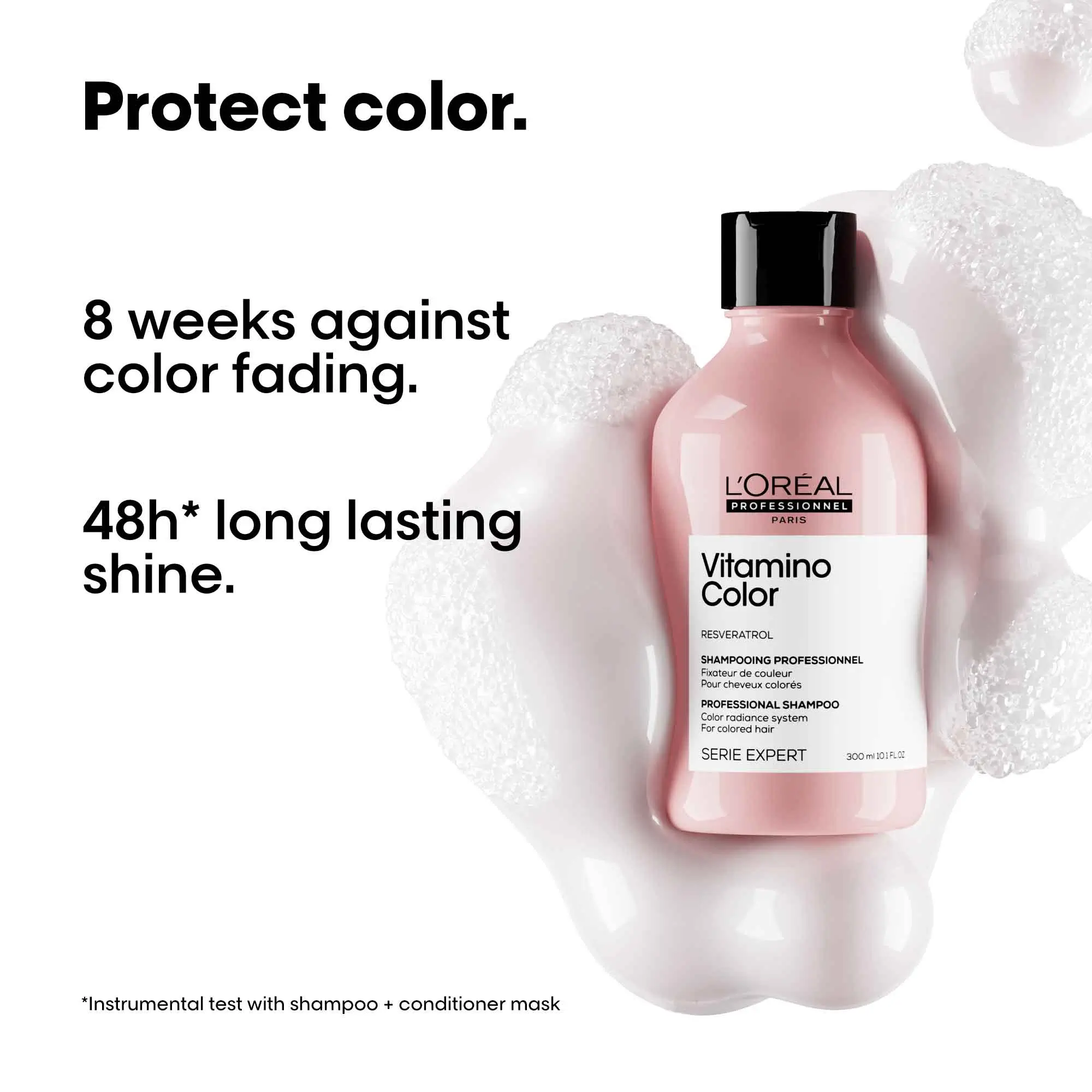 LOreal Professionnel Serie Expert Vitamino Color Shampoo is specially designed for color-treated hair. Enriched with Resveratrol, a powerful antioxidant, this professional shampoo gently cleanses the hair while protecting hair color from fading for up to 8 weeks.